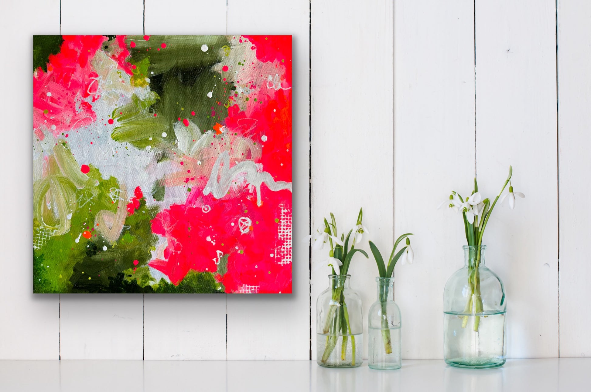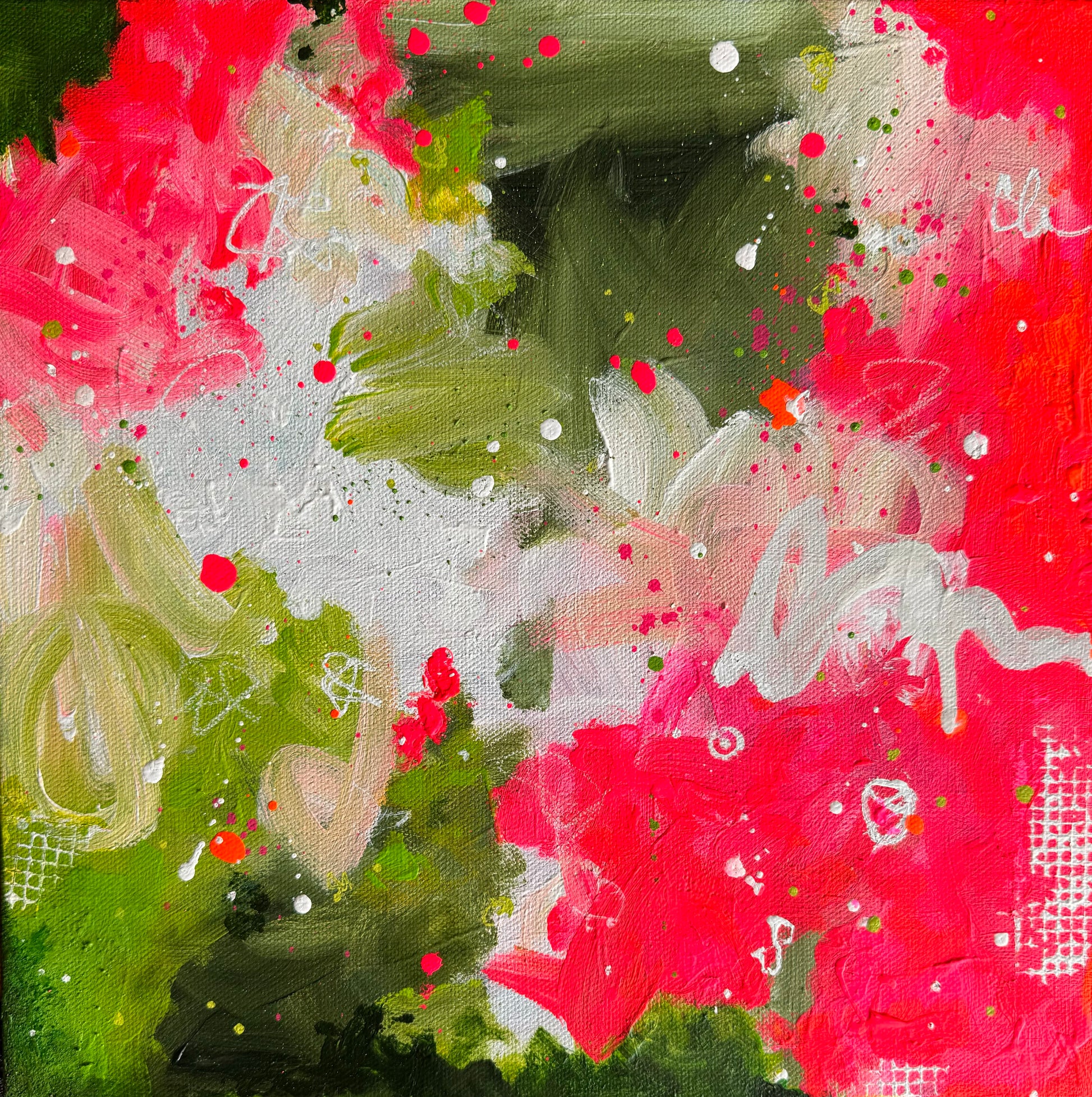 Vibrant small abstract painting featuring neon pink and orange, white, deep green, and spring green hues. Perfect for adding a splash of color and energy to any space.