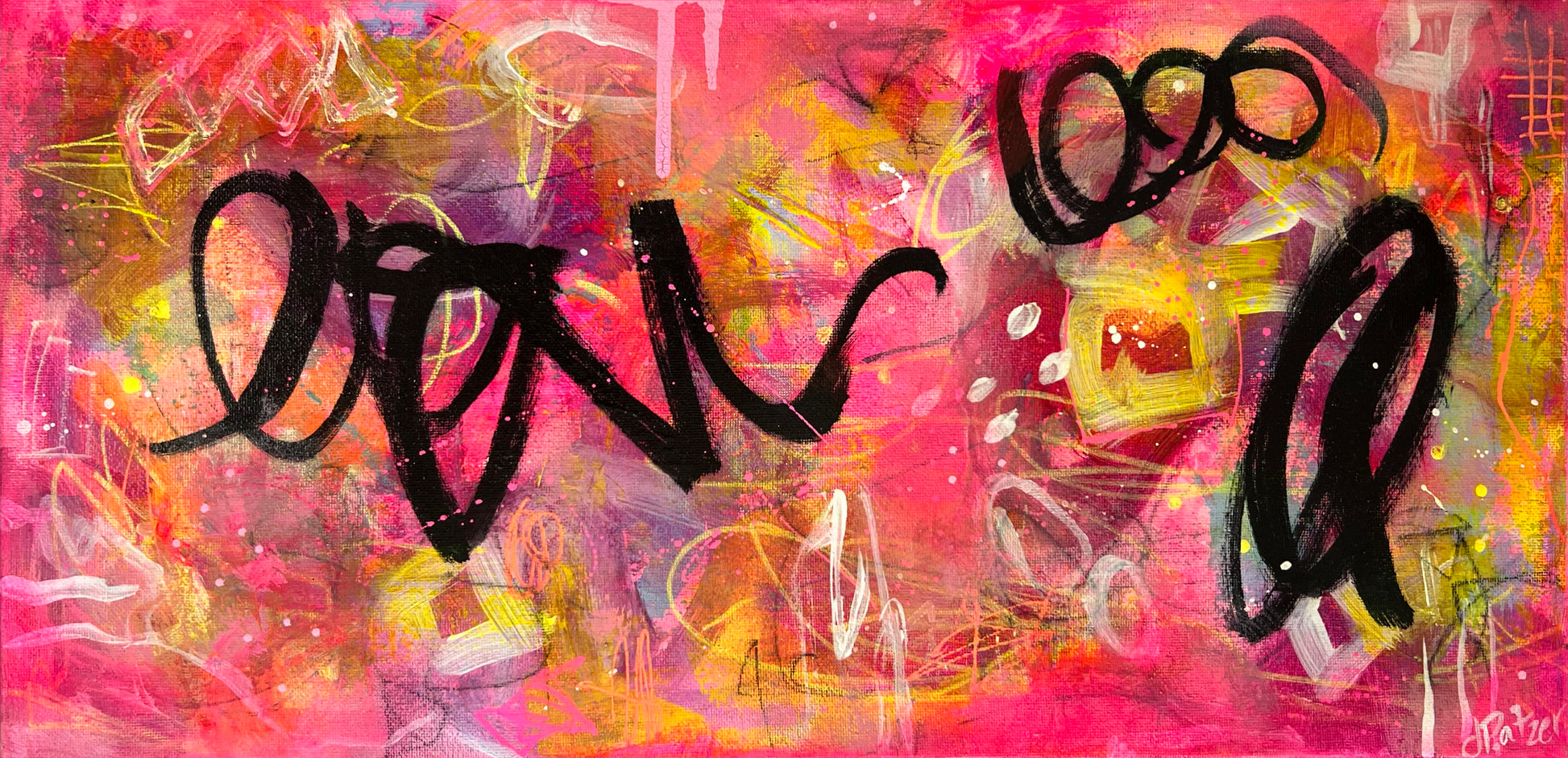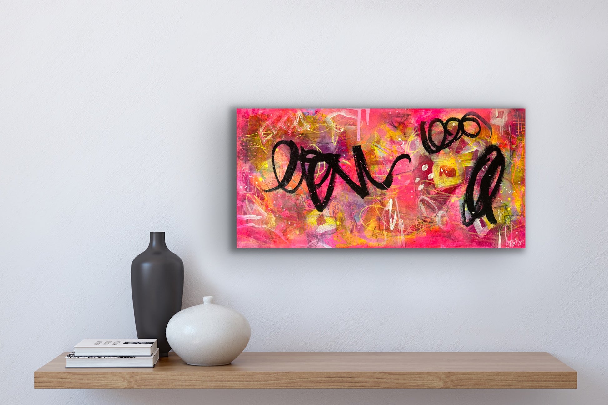 "Discover the joyous interplay of pink and yellow hues in this painting. Bold black graffiti markings inject a dynamic edge, creating a lively juxtaposition against the vibrant colors. This artwork encapsulates the essence of artistic spontaneity, inviting you to explore the creative tension between boldness and vibrancy."