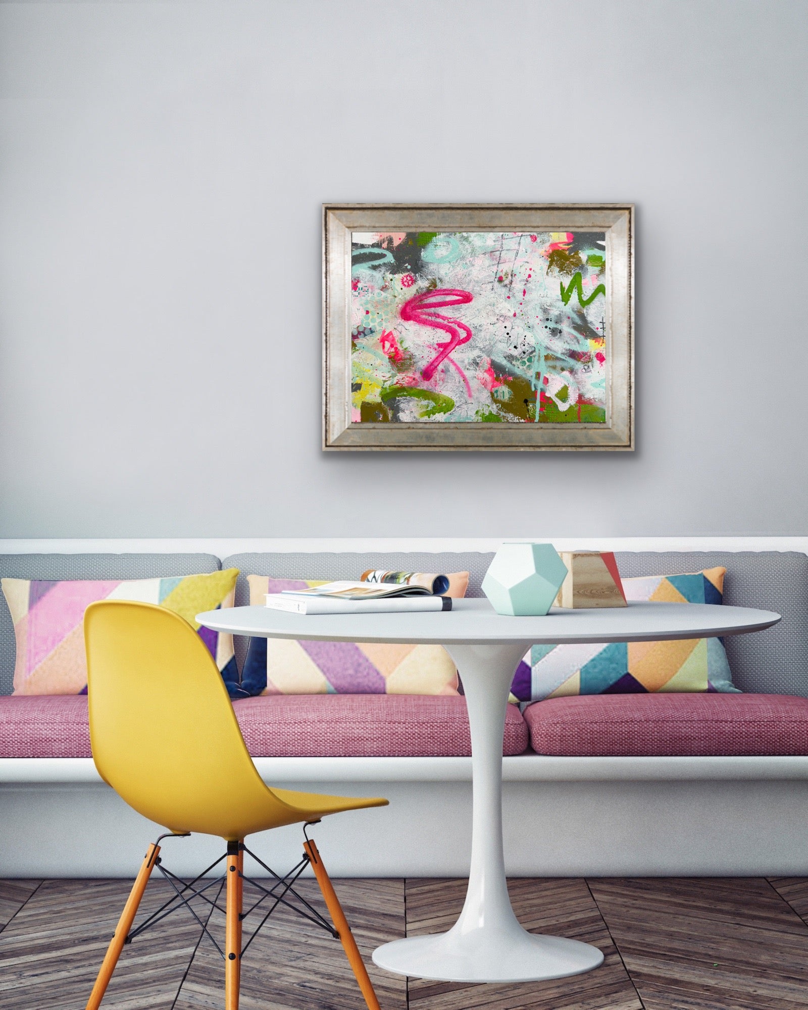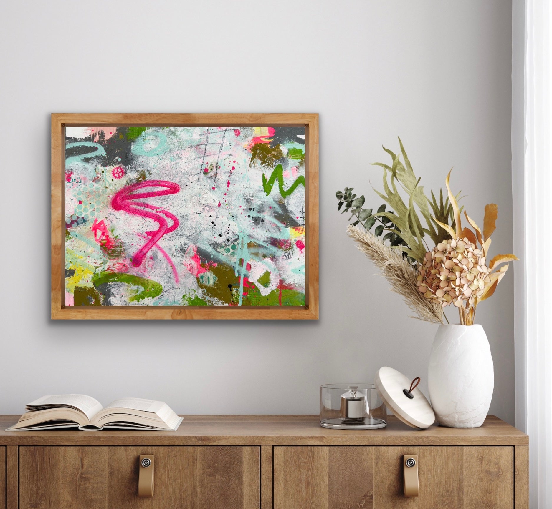 Small abstract painting that blends soft tones with bold marks, creating a gentle yet confident visual impact.