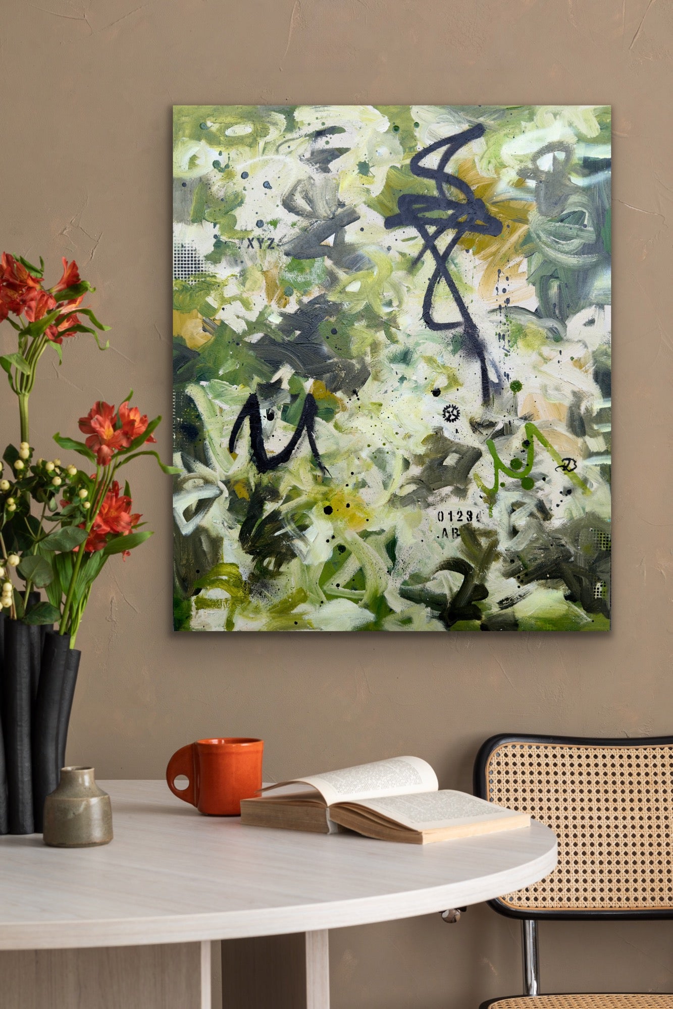 An abstract painting blending rich green hues and ivory shades, highlighted by striking black markings that create depth and movement.